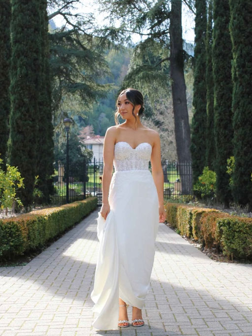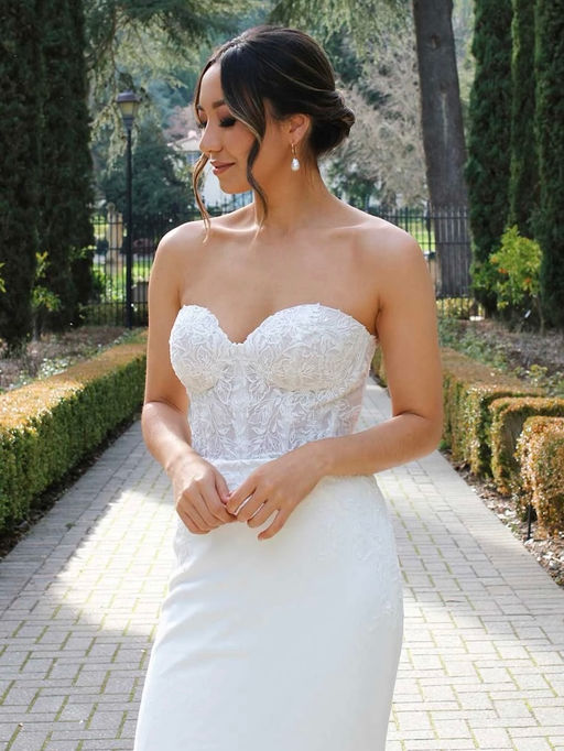 Elegant vintage inspired column dress with strapless corset style bodice, floral lace, sweatheart neckline and delicate beaded detail. Soft crepe fabric and covered buttons on the sweeping train.