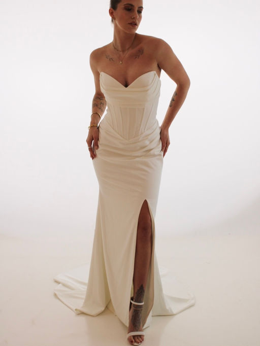 Beautiful fitted bodice in modern minamilist style. Fitted skirt with slit and overskirt/train.