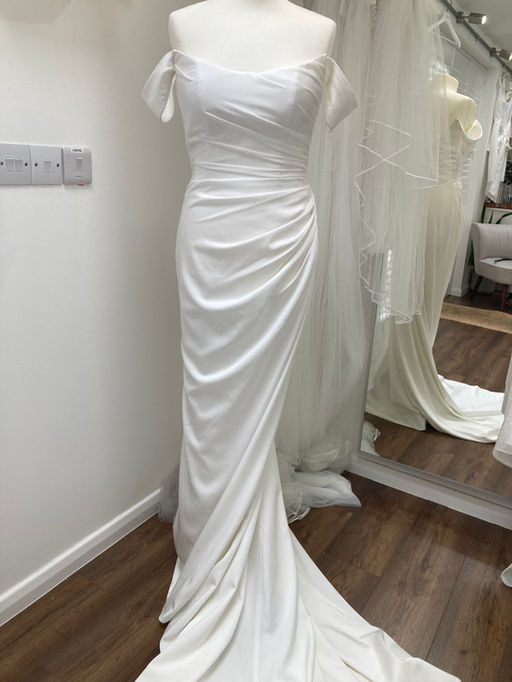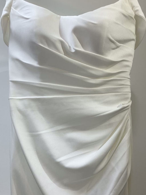 Beautifully designed with scoop neckline and peak detail to the structured bodice and detachable drop sleeves. Stunning draped skirt and sweeping train with pearl button detail.