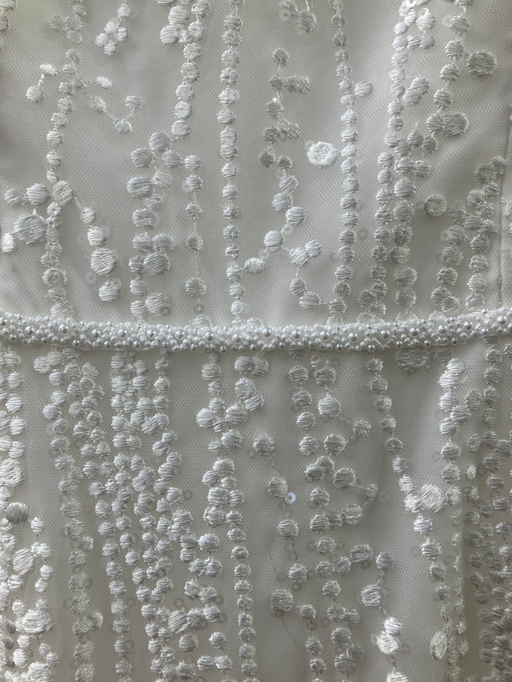 A stunning & sophisticated wedding dress, square neckline, low open back & V sheer side panels to the bodice. Fitted skirt with leg slit, covered in subtle embroidery.