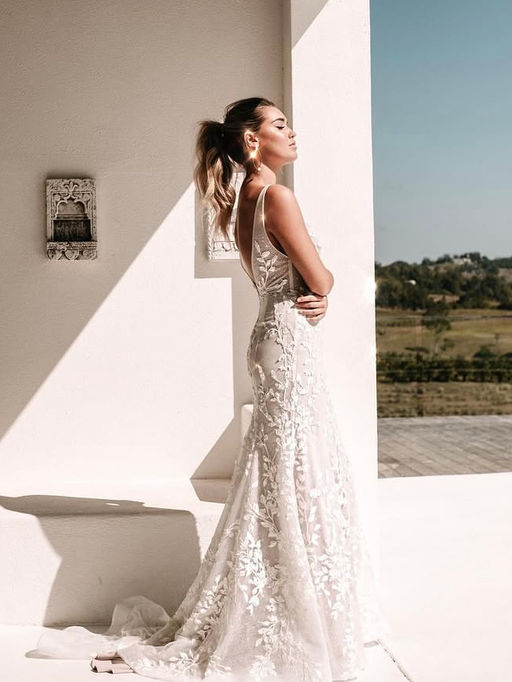 Beautiful fit and flare shape to flatter your curves with deep V plunge neckline & matching back that falls away to the waistline. Floral appliques and 3D petals and beading.