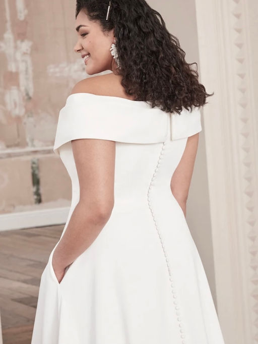 Elegant A line crepe dress, beautiful drapped & pleated off the shoulder neckline, buttons down the back and has pockets!