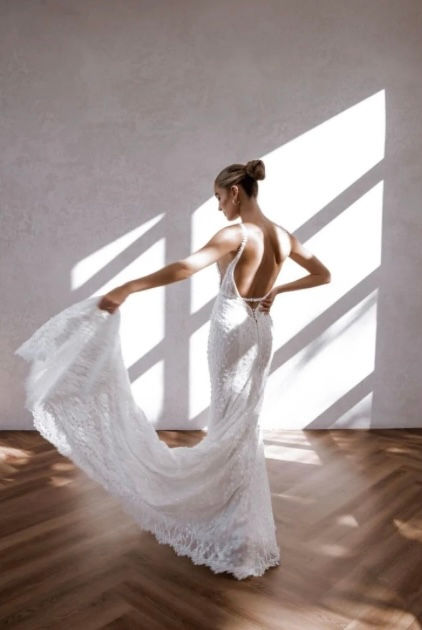 Beautiful hand sewn 3D lace with subtle sparkle adorns this stunning dress. V neckline and plunging low back & spectacular train.