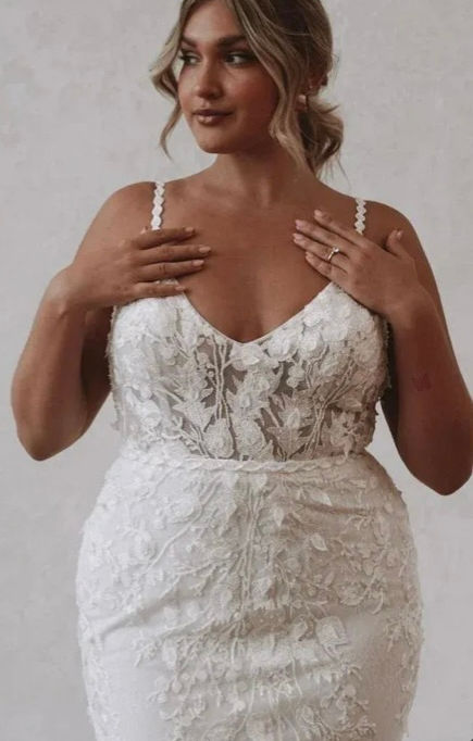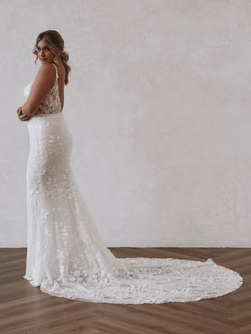 Remi hugs your curve with an amazing fit. 3D floral lace with Chantilly lace underlay that adds depth and texture to this beautiful gown. V neckline, delicate pearl straps and MWL iconic low V back.
