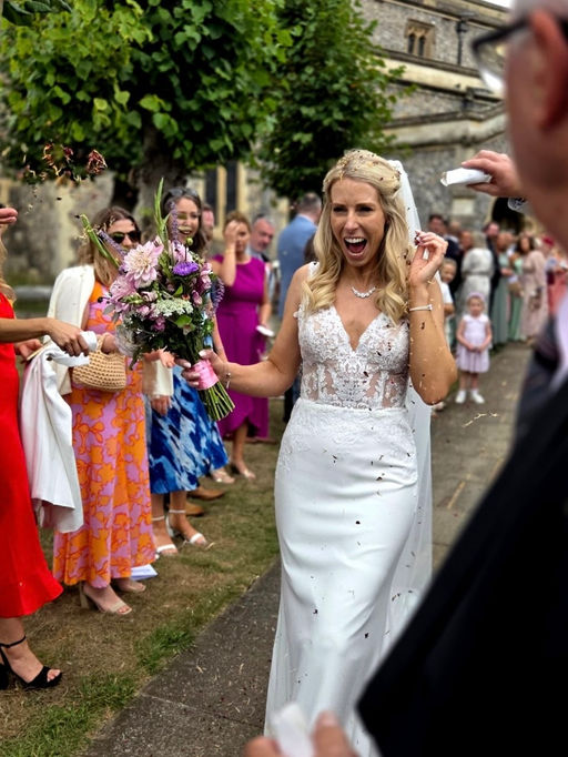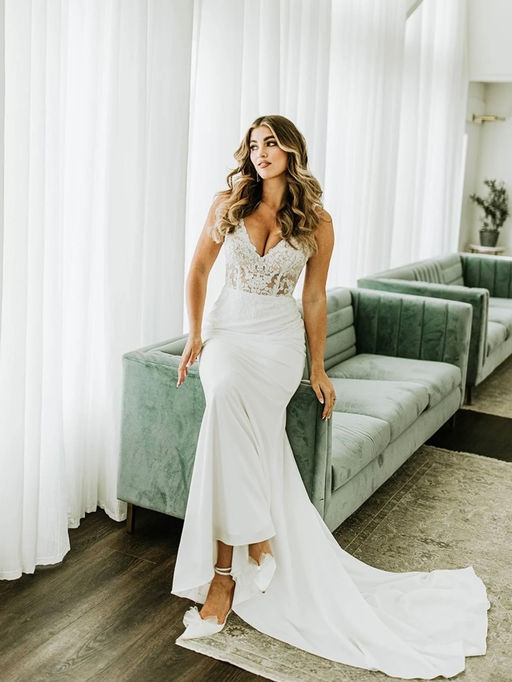 Intricate lace appliques on the bodice and straps alone with subtle boning, plungling V neckline and column silhouette which flatter your curves.Beautiful fabric covered buttons run the length of the flowing skirt.